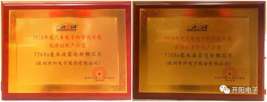 會上,開陽電子自主研發的“77GHz毫米波雷達射頻芯片”一舉獲得兩項中國汽車電子科學技術獎——“優秀創新產品獎”和“最具投資價值產品獎”。